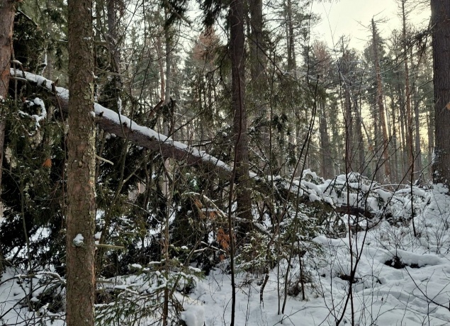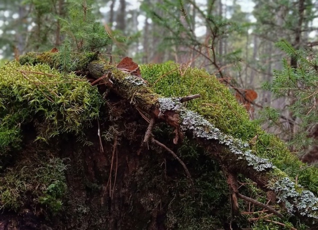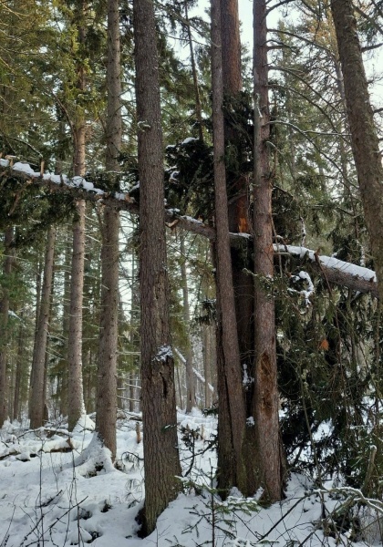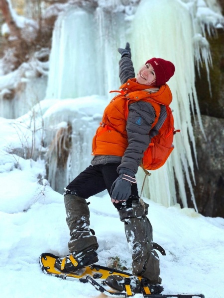Мы поднимемся вверх по реке вдоль высоких скал, укрытых мхом и снегом. Если по осени здесь приходилось лазать по камням и перебираться через бурлящую реку, теперь всё гораздо проще - идешь да идешь, прокладывая снегоступами ровную тропу. Но без приключений не обойдется. По дороге увидим пещеру, это узкий коридор вглубь скалы метров на 30 или больше. Сквозь прозрачный под снегом лёд видна бурлящая река, а таящий на моховых скалах лед образует стены льда, как застывший водопад.