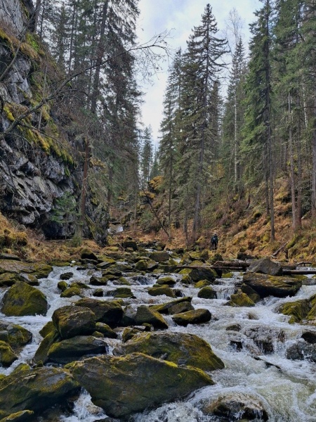 Камни покрывает толстое одеяло мха, по скалам зелёным мехом ползут лишайники, разрастаются вширь ели и пихты, а река становится все интереснее и интереснее.
